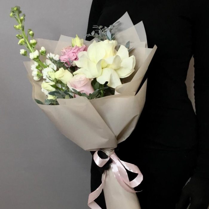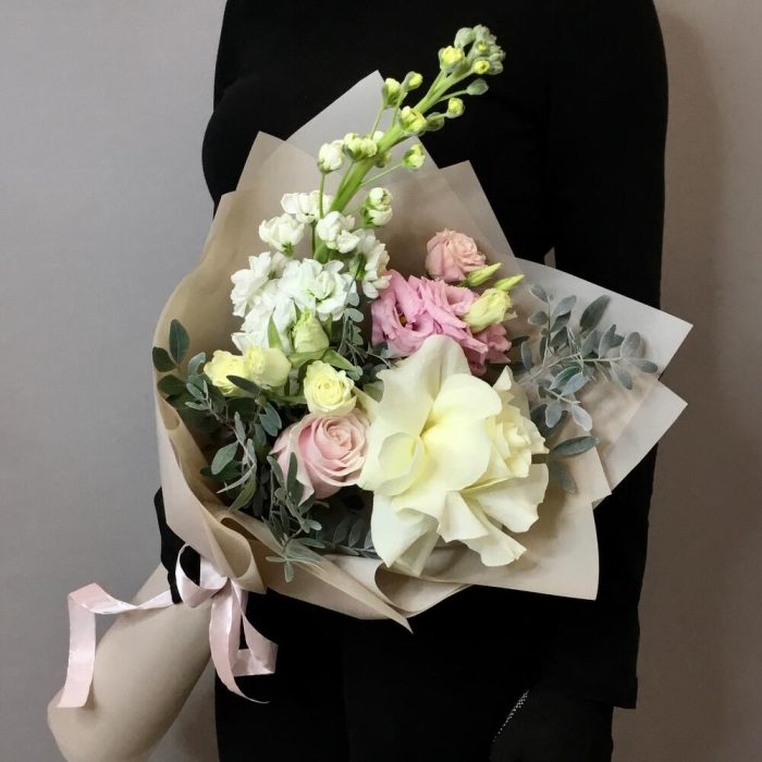 Маттиола – 1 шт.Кустовая роза – 1 шт.Роза Эквадор – 1 шт.Эустома – 1 шт.Лента атласная – 1 шт.Фисташка – 2 шт.Французская роза – 1 шт.Пленка матовая – 1 шт.подкормка для срезанных цветов – 1 шт.