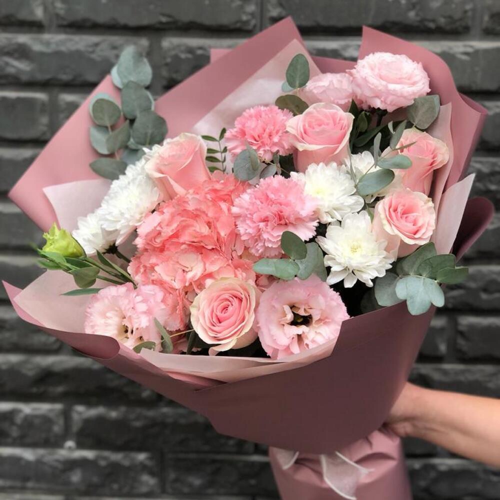 Альстромерии, Гвоздики, Кустовые розы, Лизиантусы, Розы, Хризантемы