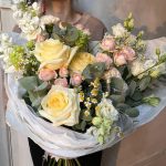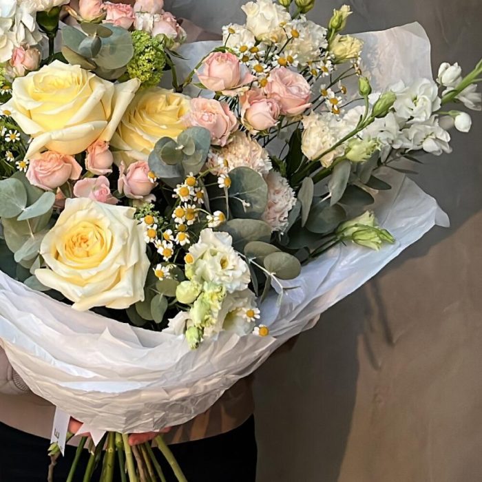 Вибурнум – 2 шт.Лизиантус – 2 шт.Маттиола – 3 шт.Роза кустовая – 3 шт.Эвкалипт – 2 шт.Матрикария – 3 шт.Роза пионовидная – 3 шт.Упаковка дизайнерская – 1 шт.