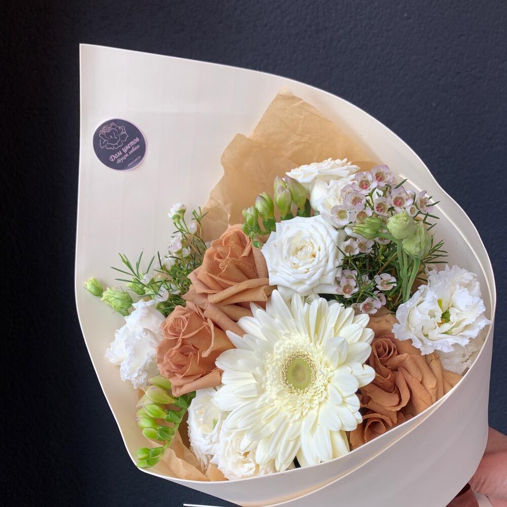 Гербера – 1 шт.Роза пионовидная – 3 шт.Лизиантус – 1 шт.Кустовая роза – 2 шт.Фрезия – 2 шт.Хамелациум – 2 шт.декоративная упаковка – 1 шт.Атласная лента – 1 шт.