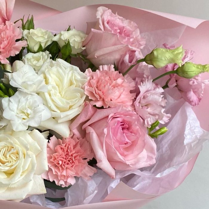 pink o’hara роза – 4 шт.плая бланка роза – 2 шт.Диантус розовый – 3 шт.Кустовая роза – 1 шт.Фрезия белая – 2 шт.Эустома алиса – 1 шт.Эвкалипт – 4 шт.Упаковка дизайнерская – 4 шт.Лента атласная – 2 шт.