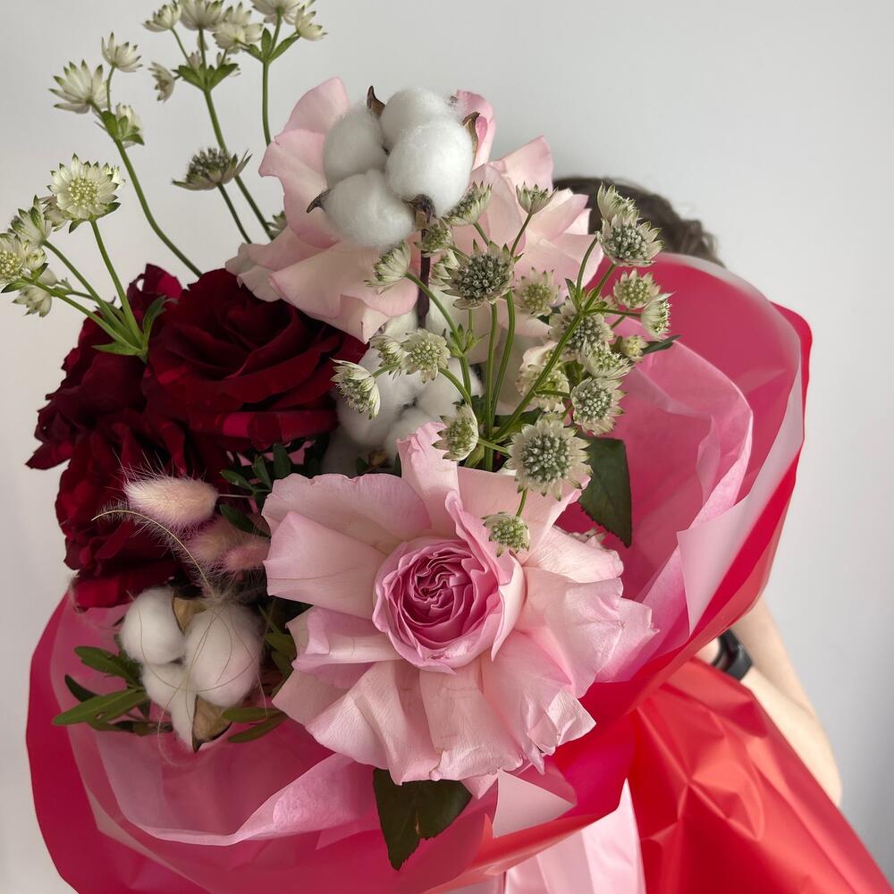 Букет с розами, хлопком и астронцией