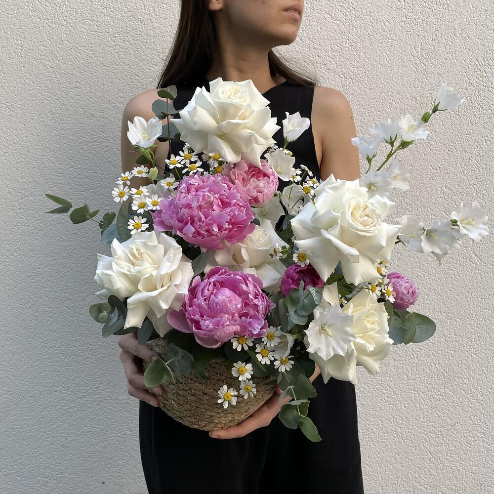 Авторская композиция в плетенном кашпо от наших топ-флористов.