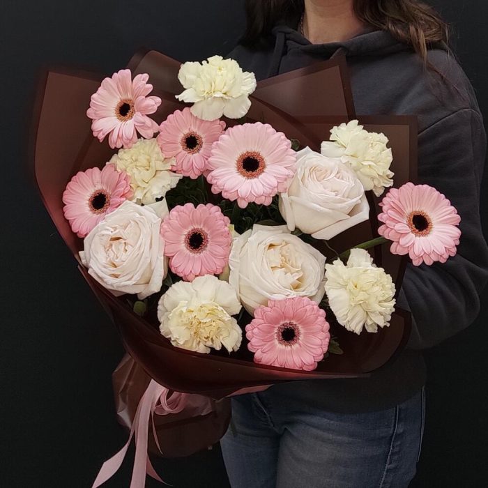 Гербера – 7 шт.Роза остина пионовидная – 3 шт.Диантус – 5 шт.Пленка матовая – 1 шт.