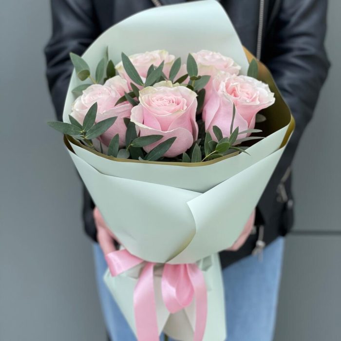 Роза пинк мондиаль – 5 шт. Эвкалипт – 1 шт. Писташ – 2 шт. Оформление – 1 шт.