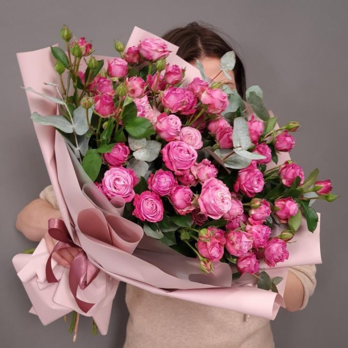 Ярко-розовые стойкие пионовидные кустовые розы Леди Бомбастик и ароматный эвкалипт.