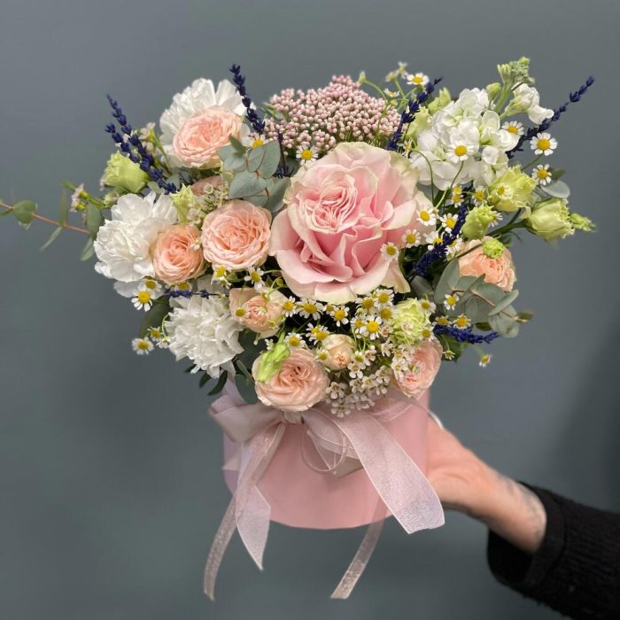 Цветочная композиция в шляпной коробке L «Утро в саду»