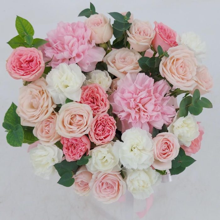 Нежные кустовые розочки, диантусы и эвкалипт в коробке. Такой презент всегда уместен и подойдёт для любого повода: День Рождения, именины, годовщина свадьбы, рождение ребенка, 8 марта, День Святого Валентина, выпускной и т.д. Можно вручить маме, сестре, подруге, коллеге, учителю, любимой.