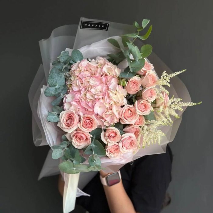 Гортензия – 1 шт. Спрей роза – 5 шт. Эвкалипт Микс – 1 шт. Астильба – 3 шт.