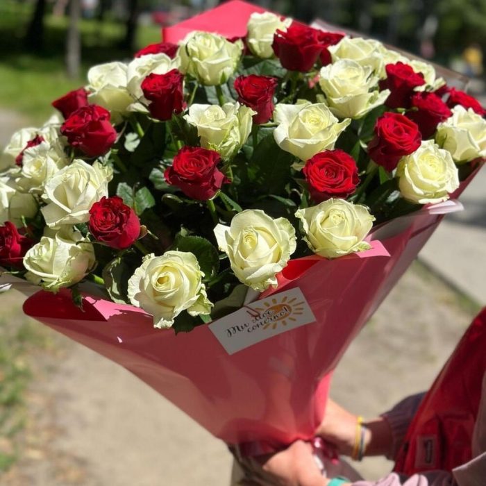 Современная упаковка – 1 шт. красная и белая роза – 51 шт.
