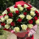 Игривый букет из 51 красных и белых роз с оформлением как бы намекают, что пора двигаться дальше в отношениях. А если ещё написать пару строк в открытке – то успех гарантирован )