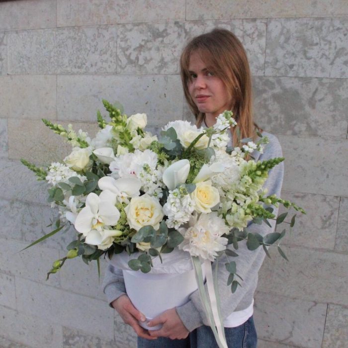 орхидея – 2 шт.Сирень – 5 шт.Роза – 9 шт.Львиный зев – 7 шт.Маттиола – 7 шт.Амми – 5 шт.Лизиантус – 4 шт.Паникум – 4 шт.Эвкалипт – 11 шт.Коробка шляпная – 1 шт.ленты атласные – 2 шт.