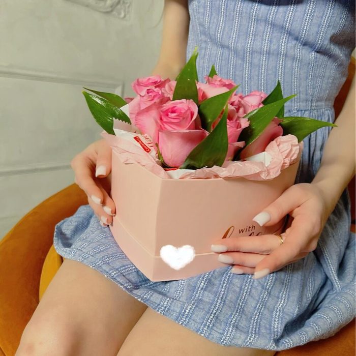“Сладкое сердце ” – цветочная композиция с сладостями в коробке “Сердце”