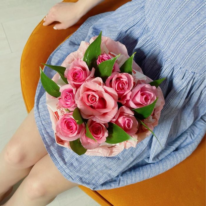 Роза – 9 шт.Рускус – 3 шт.Конфеты Raffaello – 8 шт.Тишью – 1 шт.Оазис флористический – 1 шт.Коробка сердце – 1 шт.