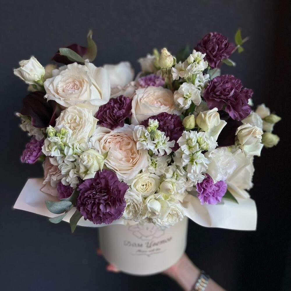шляпная коробочка m – 1 шт.Флористическая губка – 1 шт.Гвоздика – 11 шт.Маттиола – 5 шт.Лизиантус – 2 шт.Кустовая роза – 3 шт.Калла – 5 шт.Пионовидная роза – 10 шт.Эвкалипт – 2 шт.