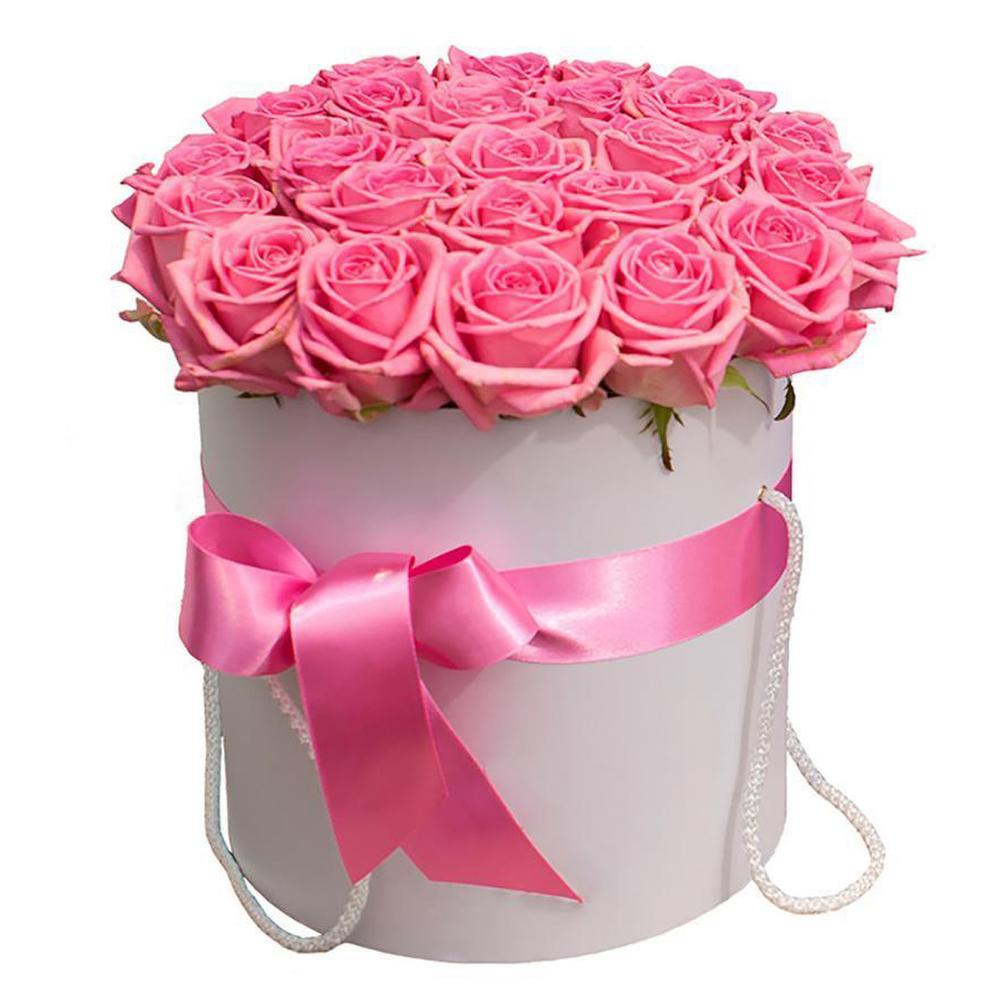 Роза розовая – 29 шт.Атласная лента – 1 шт.Оазис флористический – 2 шт.Шляпная коробка белая – 1 шт.