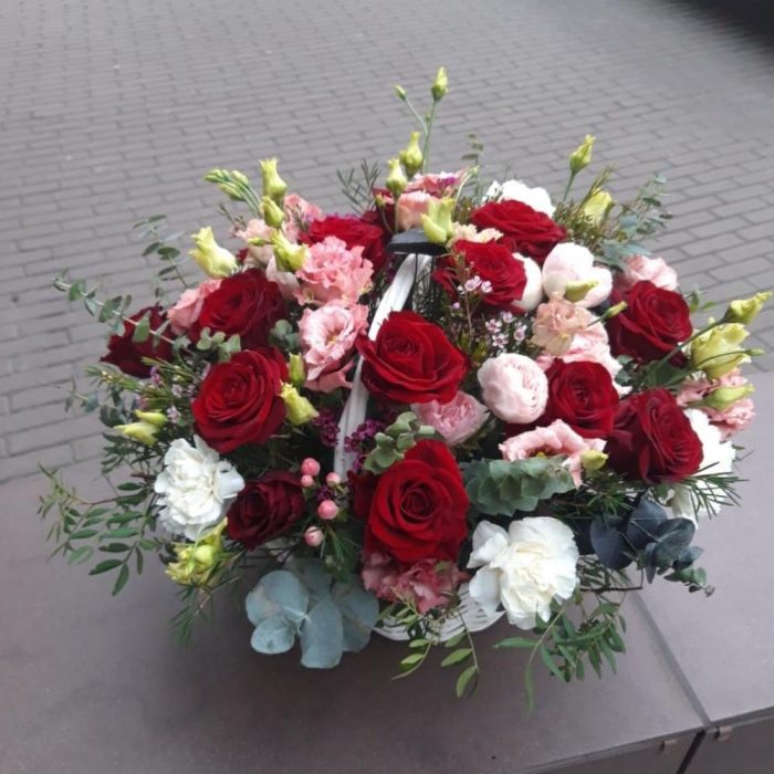 Эвкалипт – 10 шт.Роза – 15 шт.Кустовая роза – 5 шт.Гвоздика – 5 шт.Эустома – 8 шт.впксфлауэр – 5 шт.