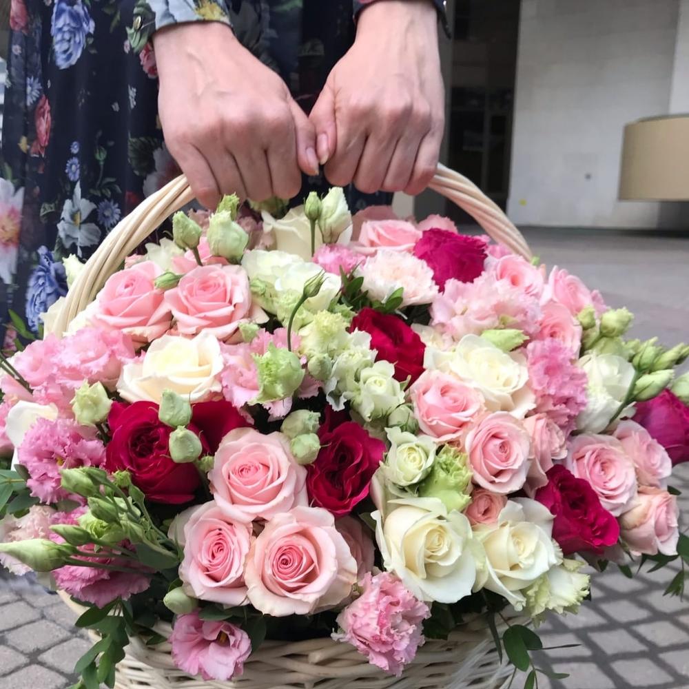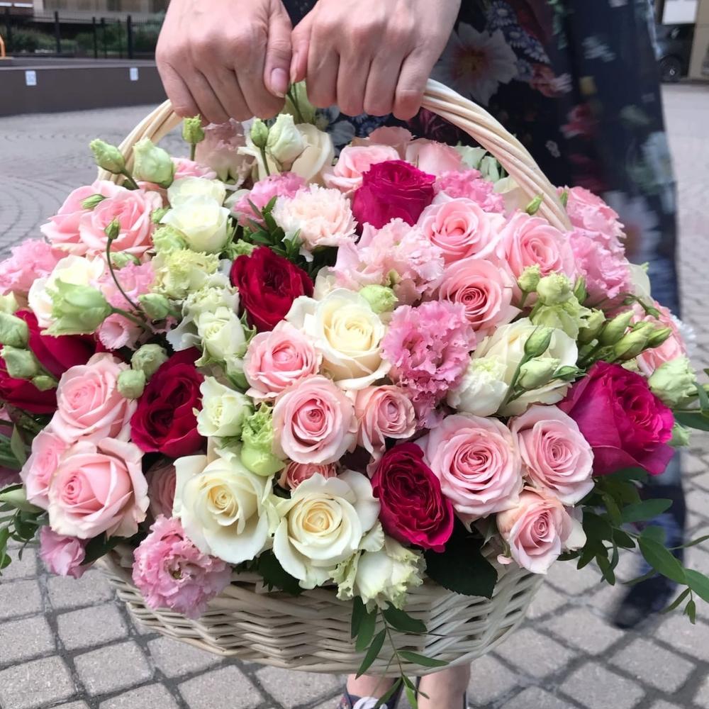роза девида остина – 7 шт.Эустома – 9 шт.Роза белая – 15 шт.Гвоздика сортовая – 5 шт.Эвкалипт – 10 шт.самшит зелень – 10 шт.Корзина – 1 шт.Оазис флористический – 2 шт.Роза кустовая розовая – 10 шт.