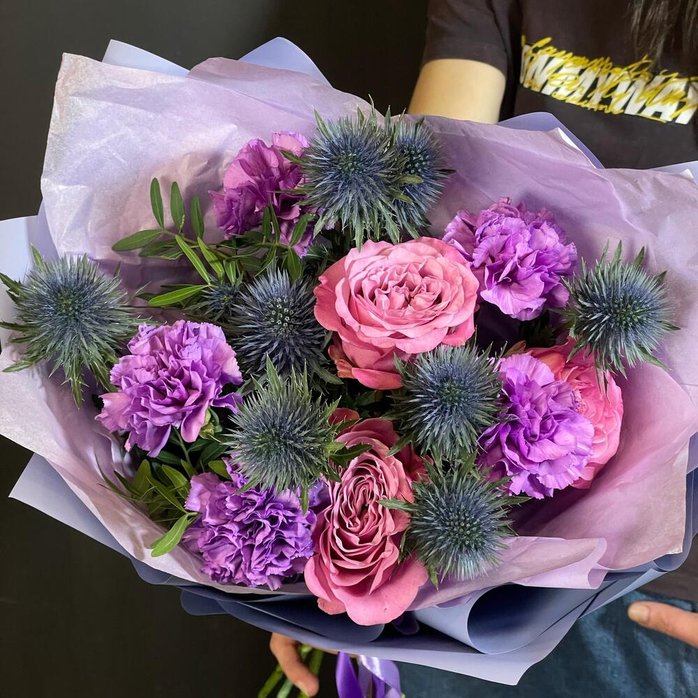 Эрингиум – 2 шт.Роза Эквадор – 3 шт.Гвоздика МунЛайт – 5 шт.Фисташка – 2 шт.Авторская упаковка – 1 шт.