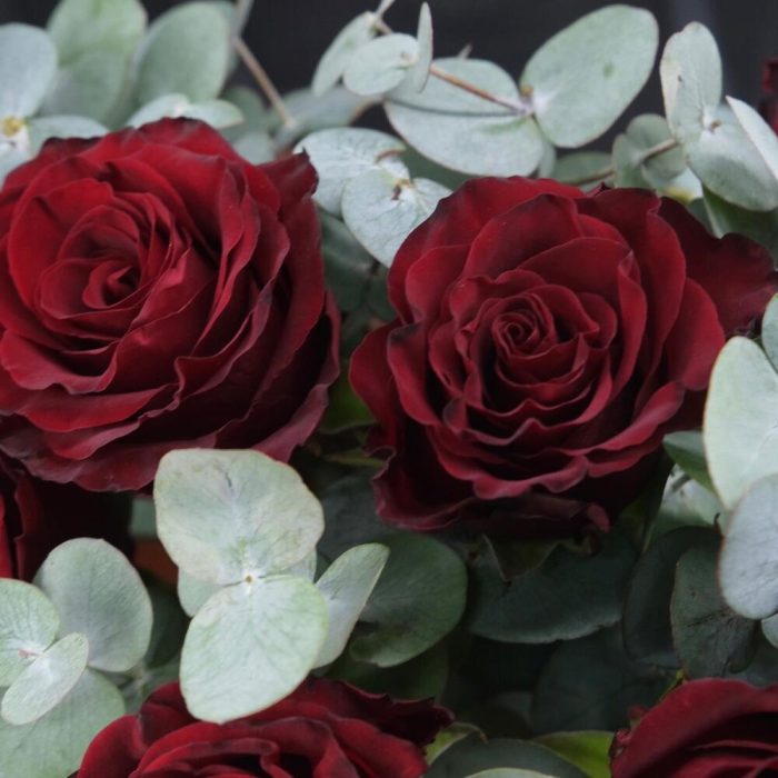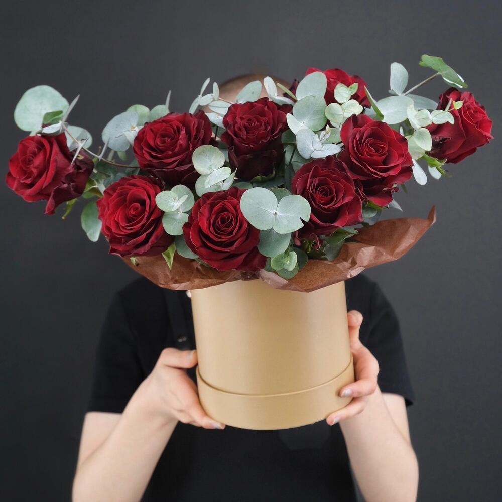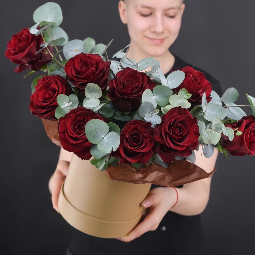 Эвкалипт – 2 шт.Роза – 9 шт.Инструкция по уходу – 1 шт.шляпная коробка с оазисом – 1 шт.подкормка для стойкости цветов – 1 шт.