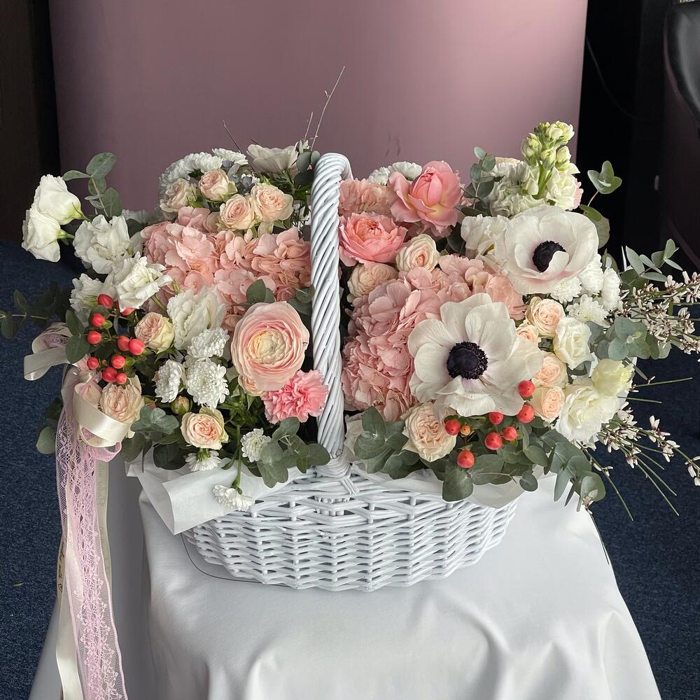 Гортензия – 2 шт.Лизиантус – 5 шт.Ранункулюс – 1 шт.Кустовая роза – 6 шт.Хризантема – 5 шт.Роза – 3 шт.Эвкалипт – 2 шт.Анемон – 2 шт.