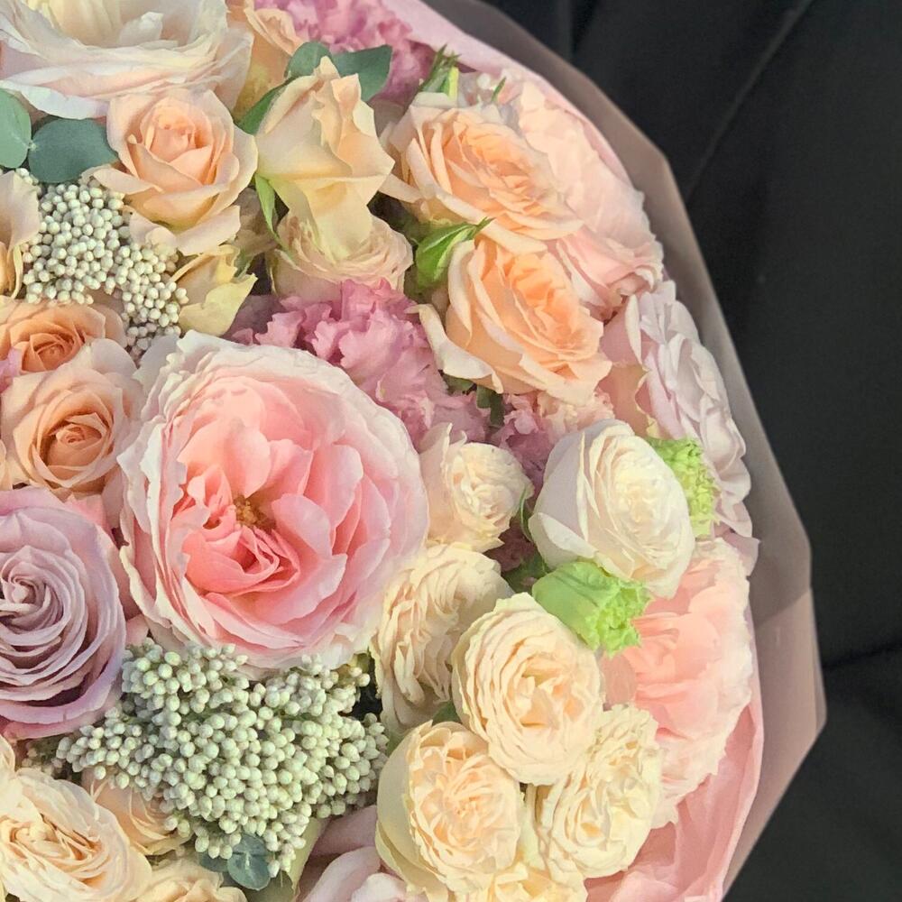 Кустовая роза – 5 шт.Лизиантус – 3 шт.Озотамнус – 2 шт.цумуги – 5 шт.фейт – 3 шт.white o’hara – 5 шт.Тишью – 3 шт.Корейская пленка – 3 шт.Лента атласная – 1 шт.