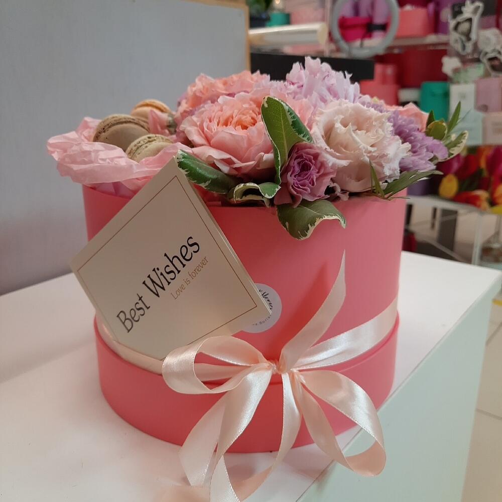 Статица – 1 шт.Хризантема кустовая – 1 шт.Коробка шляпная – 1 шт.Роза пионовидная – 3 шт.Пион Сара Бернар – 1 шт.Диантус кустовой – 2 шт.Пирожные макарон – 6 шт.Диантус сортовой – 3 шт.Эустома алиса – 1 шт.Губка флористическая – 1 шт.зелень декоративная – 3 шт.
