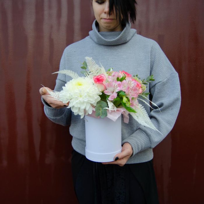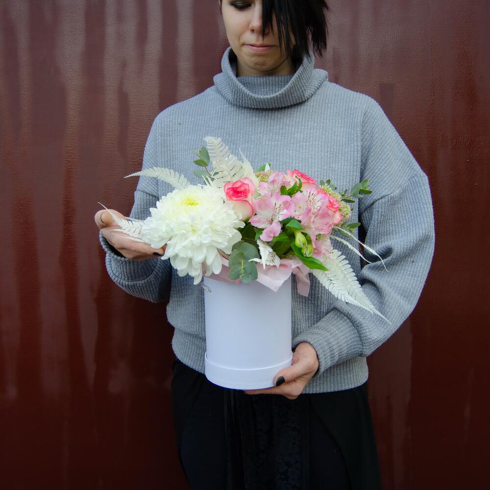 Шляпная коробка с хризантемой, гипсофилой и фисташкой