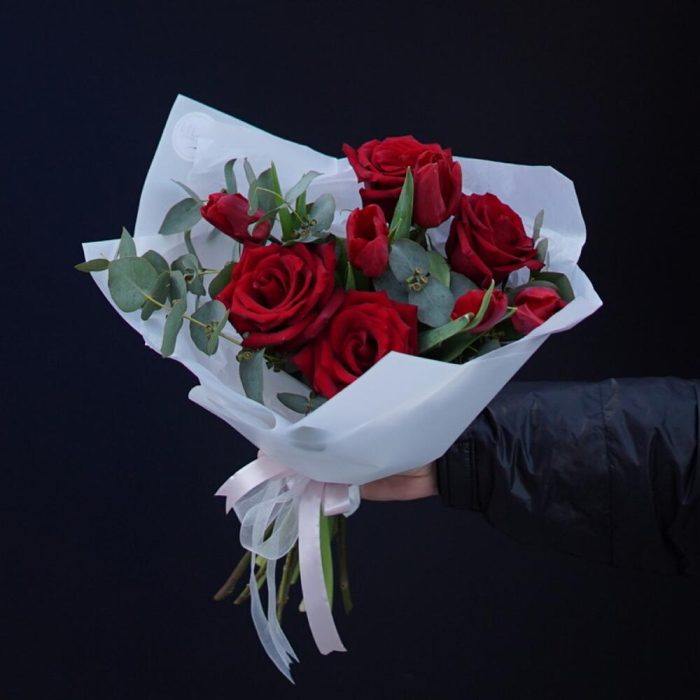 Роза красная – 4 шт. Тюльпан – 4 шт. Эвкалипт – 3 шт. Упаковка дизайнерская – 1 шт. Открыточка с вашими пожеланиями – 1 шт. инструкция по уходу за цветами – 1 шт.