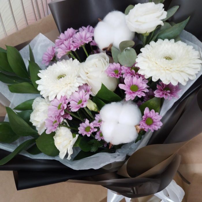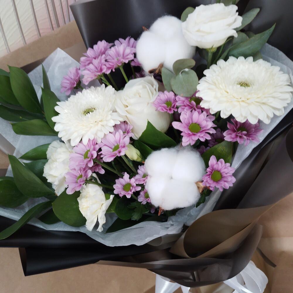 Хлопок натуральный – 2 шт.Роза Эквадор – 1 шт.Хризантема Сантини – 3 шт.эустома белая – 1 шт.Гвоздика – 2 шт.Эвкалипт – 1 шт.Рускус Израиль – 2 шт.Упаковка дизайнерская – 1 шт.Лента атласная – 1 шт.