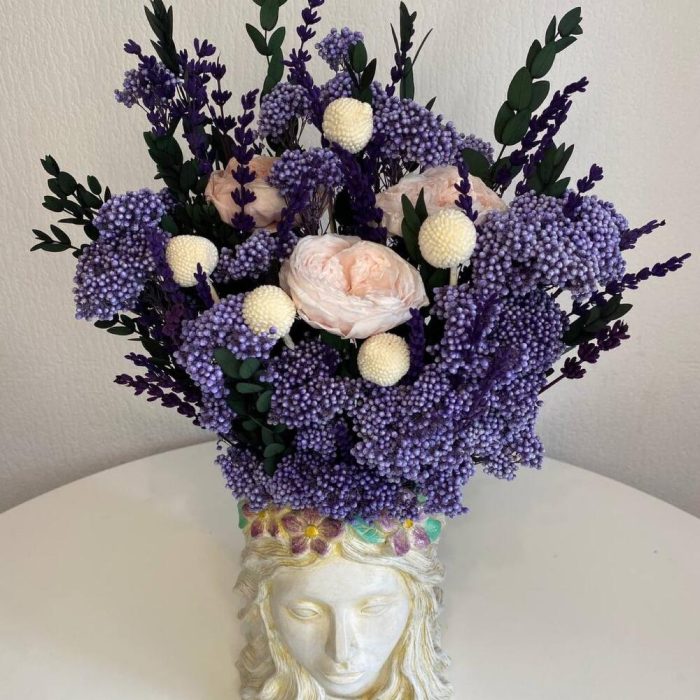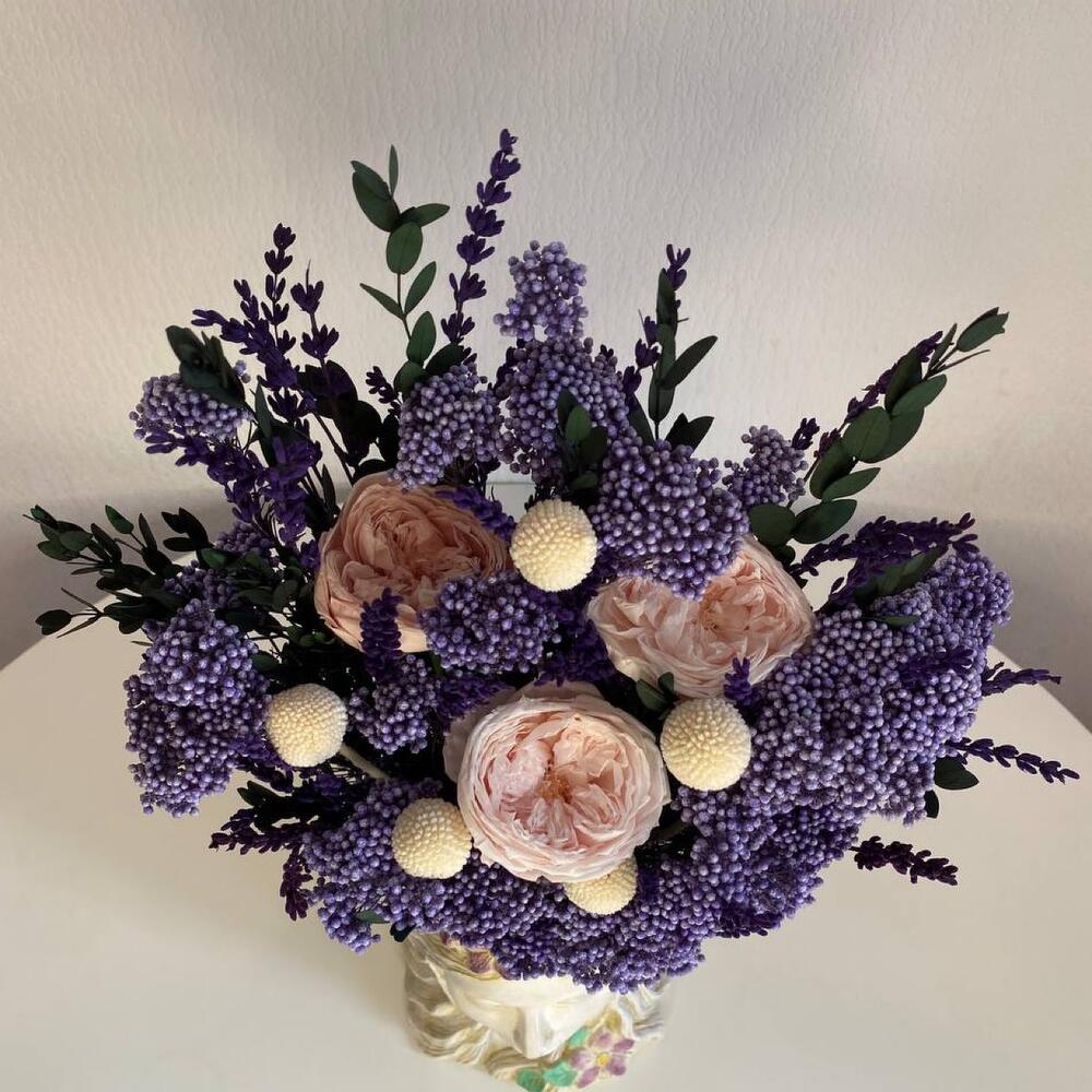 роза стабилизированная пионовидная – 3 шт.краспедия стабилизированная – 5 шт.озотамнус стабилизированный – 5 шт.Эвкалипт стабилизированный – 3 шт.лаванда стабилизированная – 20 шт.кашпо из гипсофила – 1 шт.Оазис флористический – 1 шт.
