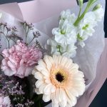 Роза белая мондиаль – 2 шт.Гербера мини – 1 шт.Гвоздика – 2 шт.Лимониум сиреневый – 1 шт.Маттиола белая – 1 шт.Лагурус (сухоцвет) – 4 шт.