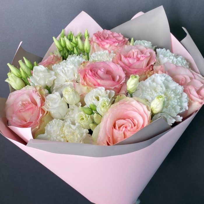 Роза Эквадор – 7 шт.Лизиантус – 4 шт.Диантус сортовой – 5 шт.Упаковка дизайнерская – 3 шт.Лента атласная – 1 шт.