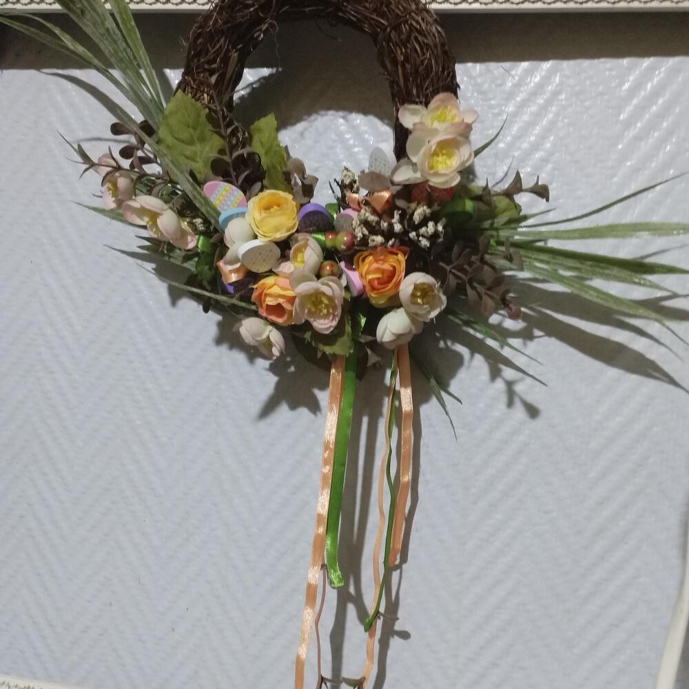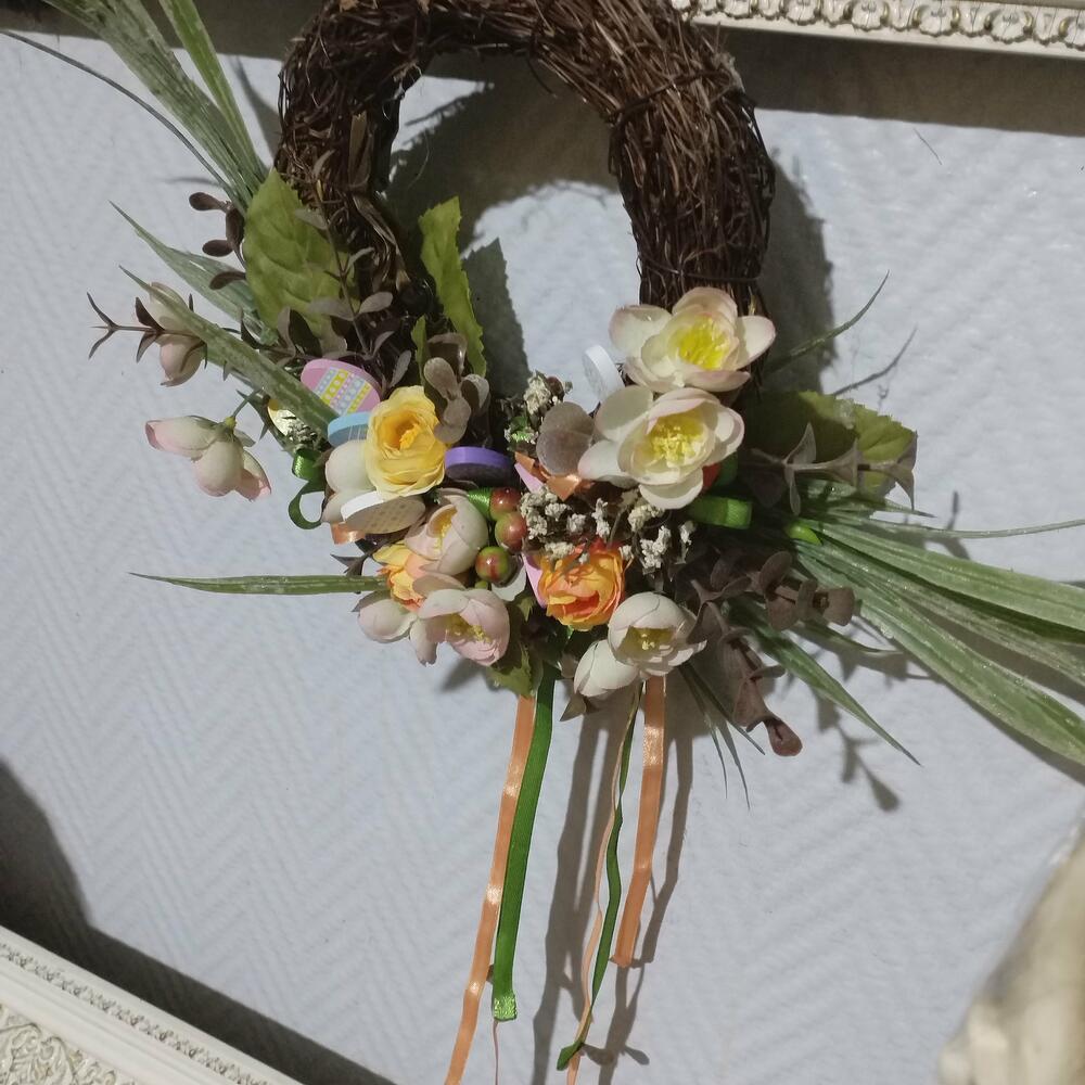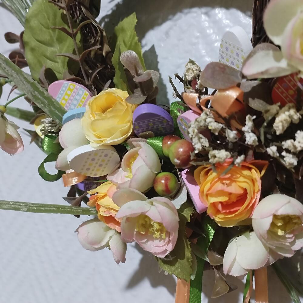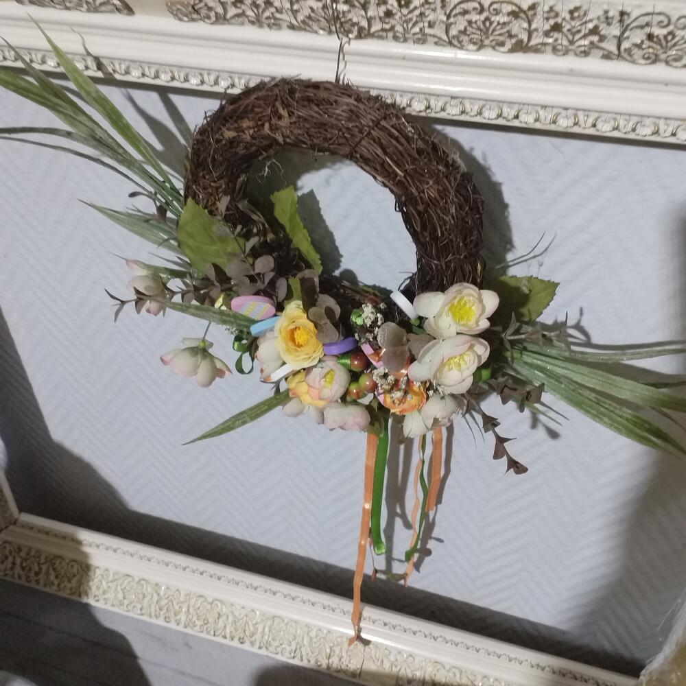каркас из мелких березавых веточек – 1 шт.деревянные декоративные яйца – 5 шт.искусственые роза – 15 шт.Лента атласная – 2 шт.ветка зеленые искусственые – 2 шт.