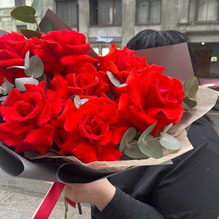 Эвкалипт – 3 шт.Лента атласная – 2 шт.Упаковка корейская пленка – 1 шт.французские розы – 7 шт.