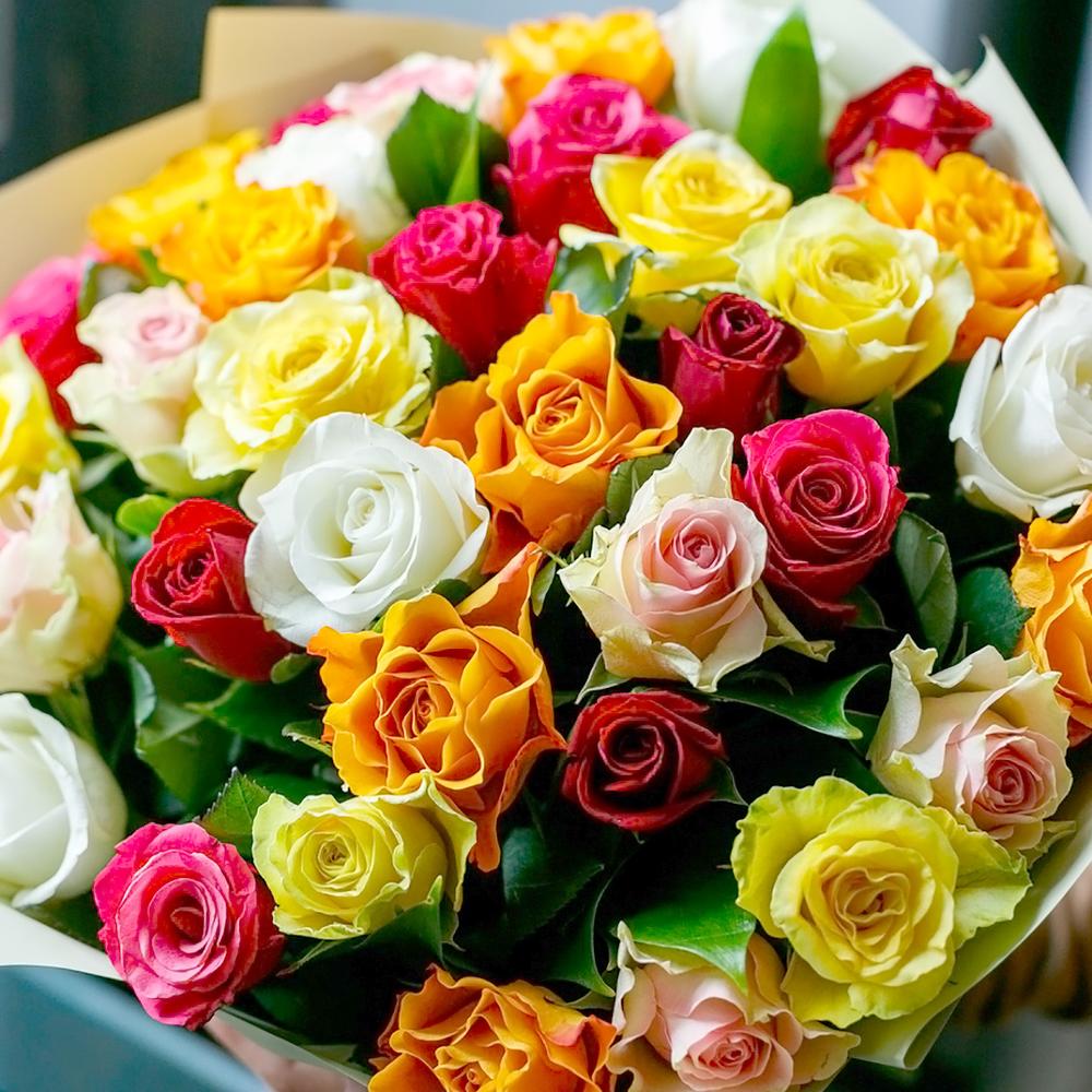 Яркий микс кенийских розочек в стильном монобукете. Такой букет подойдёт для любого повода: День Рождения, именины, годовщина свадьбы, рождение ребенка, 8 марта, День Святого Валентина, выпускной и т.д. Можно вручить маме, сестре, подруге, коллеге, любимой.
