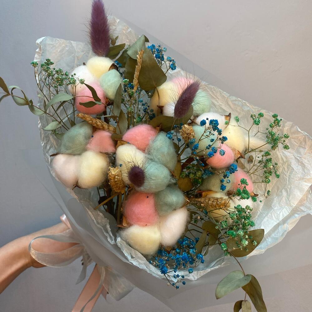 Хлопок – 7 шт.Гипсофила – 2 шт.Колосок – 3 шт.Лагурус – 3 шт.Эвкалипт – 2 шт.Авторская упаковка – 1 шт.Открыточка с вашими пожеланиями – 1 шт.
