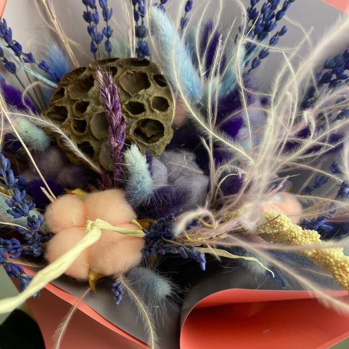 Хлопок – 7 шт.лагурус (сухоцвет) пучок – 2 шт.Лаванда (сухоцвет) пучок – 2 шт.ковыль пучок – 1 шт.Лотос сухой – 1 шт.Декор – 3 шт.Упаковка дизайнерская – 1 шт.