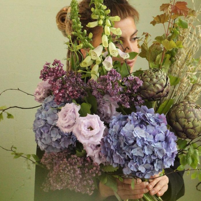 Черничный букет с гортензиями, артишоками, овсом, лизиантусом и наперстянкой.Стильное цветочное решение для любого случая.