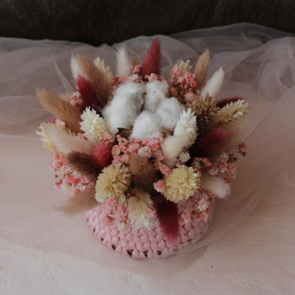 Лагурус – 15 шт.Фаларис – 8 шт.Хлопок (сухоцвет) – 1 шт.корзина вязаная ручной работы – 1 шт.