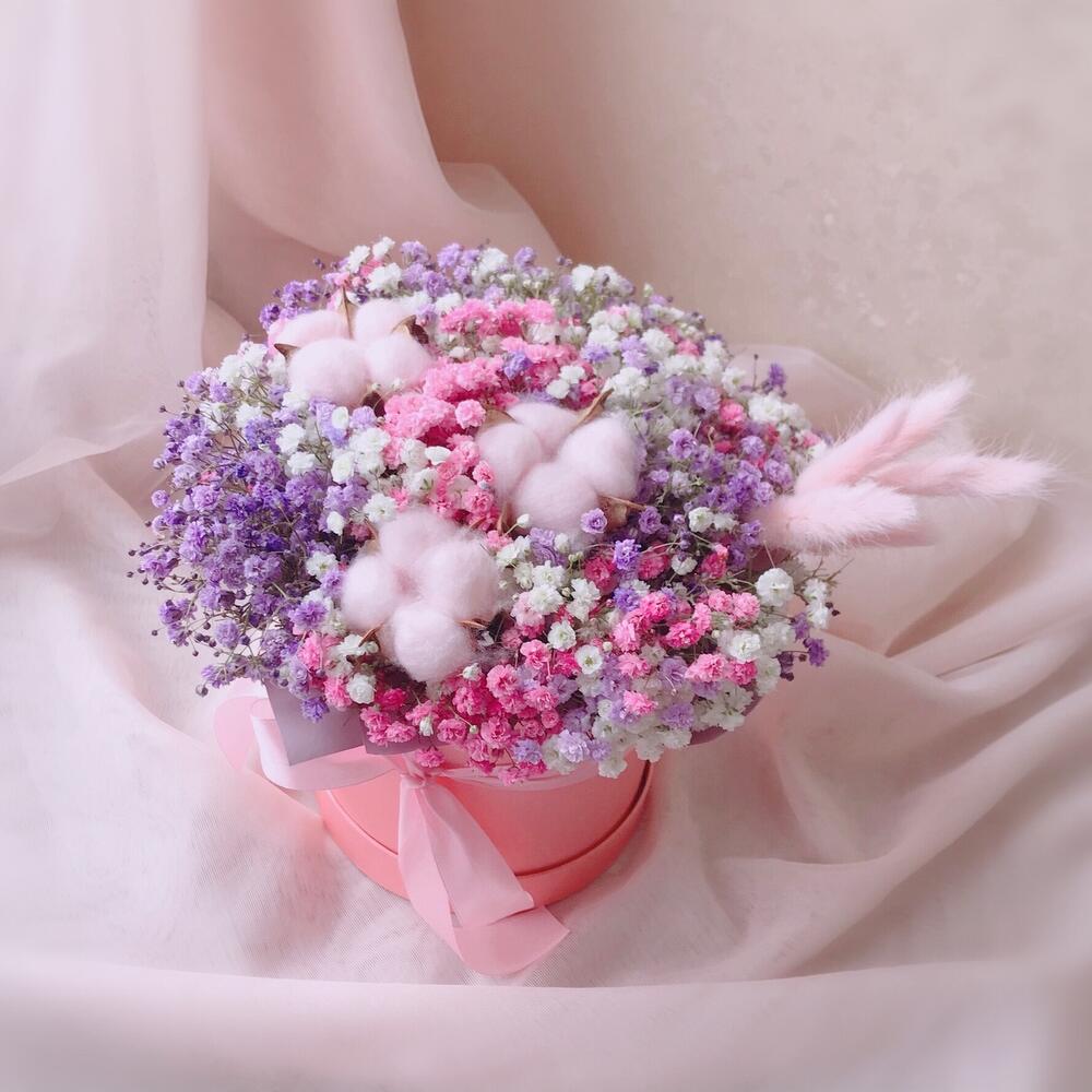 Очаровательная композиция из изысканных свежих цветов.Наполнена множеством соцветий радужной гипсофилы, мягкого хлопка и лагуруса. Собрана в стильной шляпной коробке.Композиция из гипсофилы – необычный подарок, который удивит своей невероятной стойкостью, при правильном и простом уходе.❤️ Ставить композицию в прохладном месте, избегая отопительных приборов и прямых солнечных лучей. ❤️ Подливать немного воды в серединку.Гипсофила не вянет, а становится сухоцветом, сохраняя свой вид. Поэтому композиция продолжит радовать ещё очень долго!Чтобы защитить готовый букет во время доставки от любых погодных условий, мы бережно его упаковываем