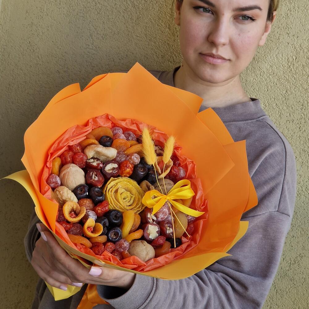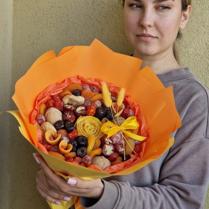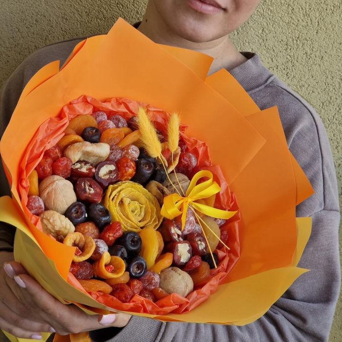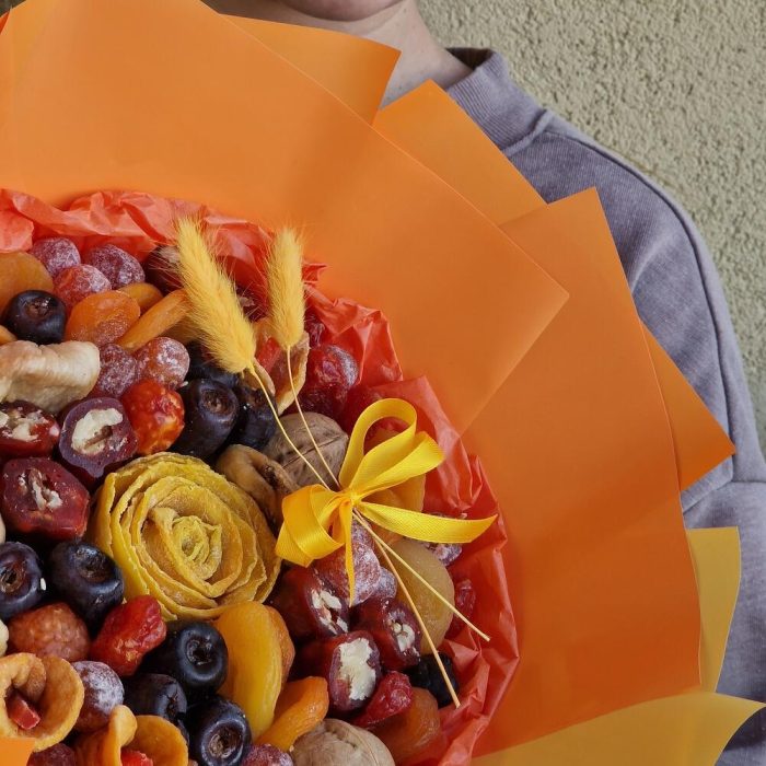манго вяленое – 70 гр.Финики – 100 гр.кумкват в сахарной пудре – 80 гр.кизил – 80 гр.курага турецкая – 105 гр.курага бобон – 50 гр.Инжир – 50 гр.персик вяленый – 30 гр.Грецкий орех – 60 гр.чурчхела – 100 гр.Папайя – 5 гр.Лагурус (сухоцвет) – 2 шт.
