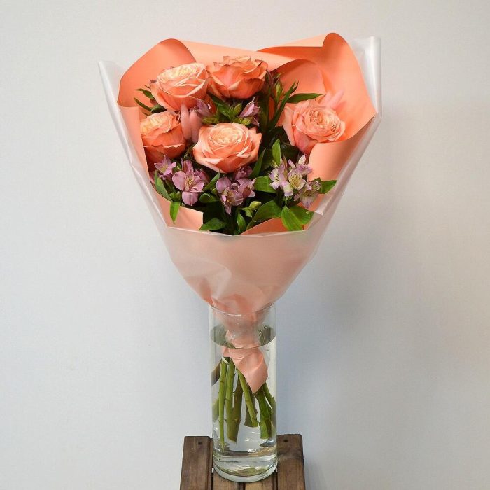 Оригинальный подарочный букет с 5 коралловыми пионовидными розами.Размеры букета: ширина 40 см, высота 55 см.В составе букета: пионовидные розы- 5 шт., альстромерия – 6 шт., лагурус, стильная упаковка букета.